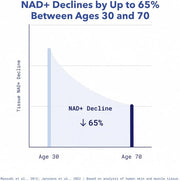 NAD+ is a vital coenzyme involved in many biological processes that support overall cellular function. Research shows that NAD+ levels naturally decline with age, particularly between the ages of 30 and 70. Tru Niagen provides a convenient way to help support healthy NAD+ levels as part of a balanced wellness routine.