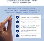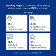 Patented Niagen® is supported by decades of research, including multiple peer-reviewed human clinical studies. These studies demonstrate its ability to increase blood NAD+ levels, reinforcing its role in supporting cellular health and energy metabolism.