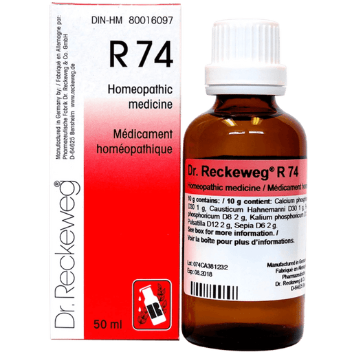 Dr. ReckewegDr Reckeweg R74 IngredientsDrops: Medicinal Ingredient per dose: Calcium phosphoricum D30 Causticum Hahne-manni D30 Ferrum phosphoricum D...