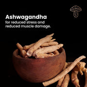 - ASHWAGANDHA: Reduces stress by lowering serum cortisol levels. Reduces muscle damage by stabilizing serum creatine kinase.