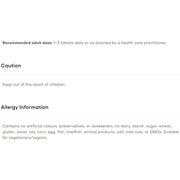 Contains no artificial colours, preservatives, or sweeteners; no dairy, starch, sugar, wheat, gluten, yeast, soy, corn, egg, fish, shellfish, animal products, salt, tree nuts, or GMOs. Suitable for vegetarians/vegans.